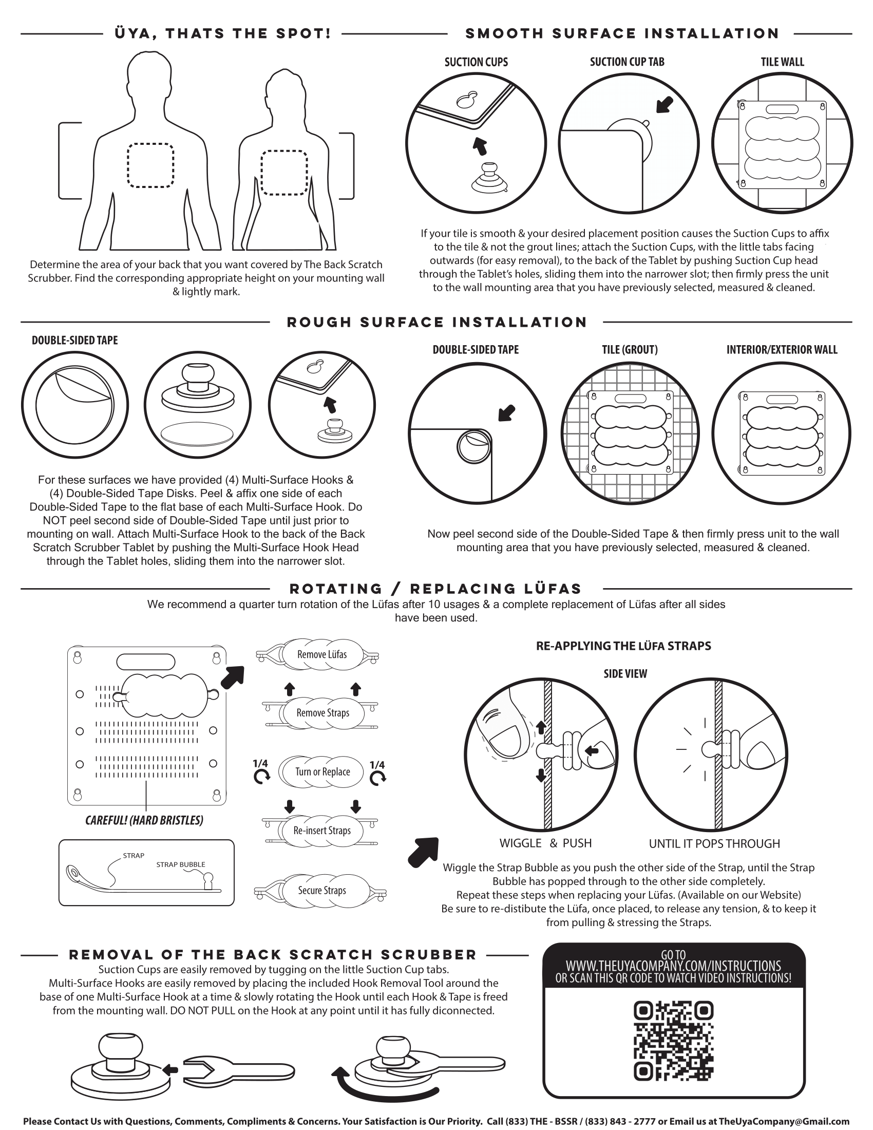 PLEASE KEEP all plastic wrappers and small parts out of the reach of children. These are Choking Hazards. PLEASE BE CERTAIN that your back easily reaches The Back Scratch Scrubber when selecting your mounting wall. Stretching or exerting yourself while pressing your back against The Back Scratch Scrubber could result in slipping, falling or serious injury. PLEASE DO NOT stand on a slippery, soapy, slick or irregular surface while using The Back Scratch Scrubber; a serious slip, fall or injury could occur. PLEASE DO NOT use The Back Scratch Scrubber on an area of red, broken or irritated skin. If any skin irritation occurs after usage, please contact your primary physician or dermatologist for medical evaluation prior to continuing use. PLEASE DO NOT use The Back Scratch Scrubber near an open flame or excessive heat. The Back Scratch Scrubber is NOT fire retardant. Suction Cups may loosen over time, always secure before use. We have designed The Back Scratch Scrubber Tablet with hard, plastic Bristles to keep your Lüfas firmly in place during use. It is important to NEVER leave The Back Scratch Scrubber unattended while the Lüfas are off of the tablet, with the hard, plastic bristles exposed; especially around children. Please promptly dispose of any of The Back Scratch Scrubber Tablet Bristles should they break off, as this may pose as a slipping hazard and/or choking hazard for children and animals. Your Back Scratch Scrubber should continue to firmly hold the Lüfas in place, should any of the Tablet Bristles break. The Back Scratch Scrubber was designed with an opening to be used as handle for easy transportation, this opening is NOT to be used in any way shape or form as a “Grab Bar” or any form of stability support.